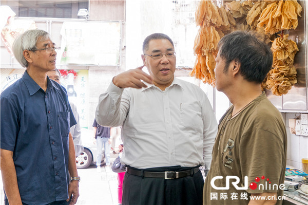 澳门行政长官崔世安向十月初五街上的海味店主了解风灾后市面恢复情况