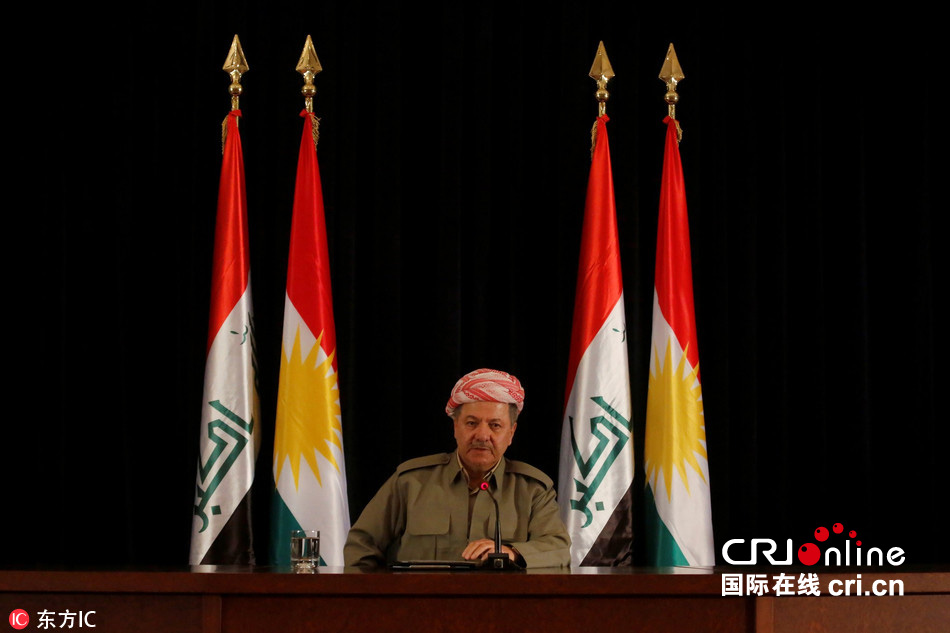 当地时间2017年9月24日,伊拉克埃尔比勒,伊拉克库尔德自治区(库区)主席马苏德-巴尔扎尼出席新闻发布会,确认尽管面临多方反对,库区仍将于25日如期举行独立公投。图片来源:东方IC