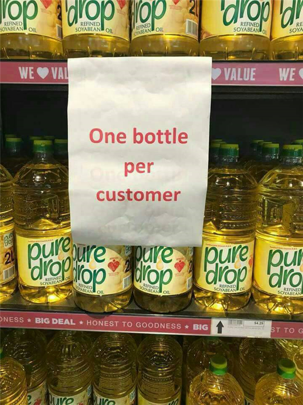 食用油是本次囤货风潮中的绝对主角。记者走访哈拉雷市区的多个超市发现,售价约为3.3美元左右2L的平价大豆油在超市里已经不见踪影,货架上只能见到售价约3.3美元一瓶的(1L)芥花油,或是4美元左右2L的葵花籽油,以及更为昂贵的橄榄油。有些超市顾客们可以一下买一箱12瓶芥花油,但在一些超市,每名顾客只能购买四瓶甚至一瓶食用油。