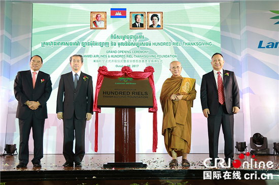 柬埔寨佛教法宗派布格里僧王、中国驻柬埔寨大使熊波、澜湄航空董事长李昆共同为“百分感恩”慈善基金揭牌