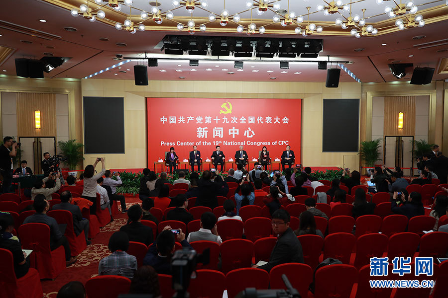 10月20日,十九大新闻中心举办集体采访活动,主题为“实施创新驱动发展战略”。图为集体采访现场。新华网 郝广鹏摄