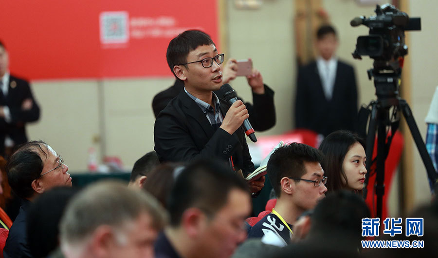 10月20日,十九大新闻中心举办集体采访活动,主题为“文化发展开创新局面”。图为光明日报融媒体记者提问。新华网 翟子赫摄