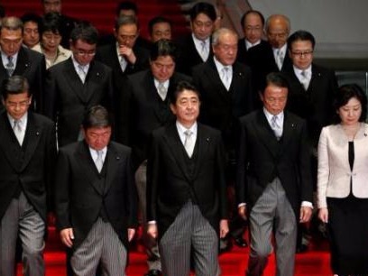 在日本东京首相官邸,日本首相安倍晋三(前排中)带领阁僚合影。