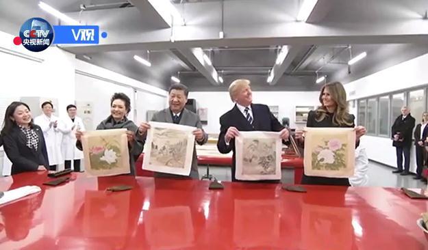 两国元首夫妇先后观赏了钟表、木器、金属器、陶瓷、纺织品、书画等文物修复技艺展示,并共同观看了珍品文物展。习近平和夫人彭丽媛邀请特朗普夫妇体验书画装裱工序的关键环节——托画心。
