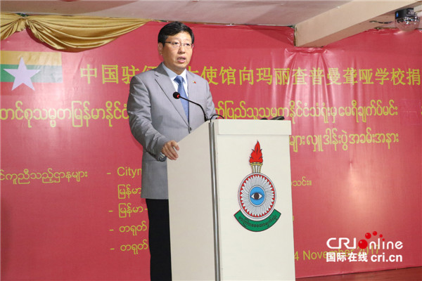 国际在线报道(中国国际广播电台记者 洪荃诠):11月14日,中国驻缅甸大使馆在仰光玛利·查普曼聋哑学校举行物资捐赠仪式。中国驻缅甸大使洪亮、玛丽·查普曼聋哑学校校长杜纽纽登、缅甸最大零售连锁超市City Mart执行董事杜温温丁、缅中交流合作协会负责人、使馆人员以及在校师生代表等参加了捐赠仪式。