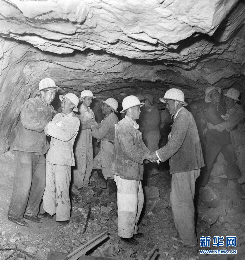 宝成铁路秦岭隧道在1955年9月26日全部凿通。图为南北两段工人在会师时互相庆贺(资料照片)。新华社发