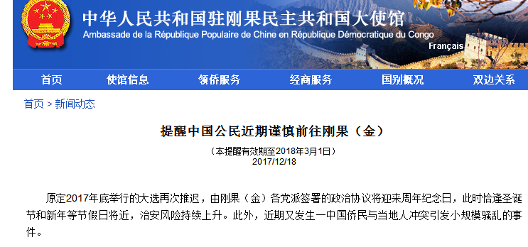 外交部领事司和中国驻刚果(金)使馆提醒中国公民密切关注当地局势,谨慎前往刚果(金)。新年将至,有条件回国探亲、休假的人员,希节前回国与家人团聚。工作和居住在金沙萨郊区及平民聚居区等易发生骚乱地区的人员尽快撤出危险区域。