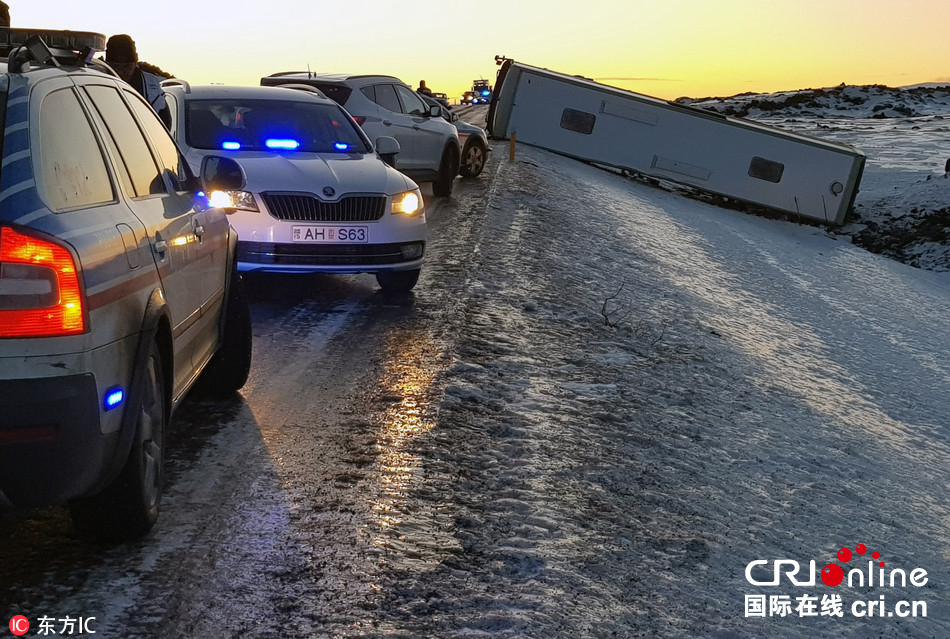 当地时间2017年12月27日,一辆载有40余名中国游客的大巴在冰岛南部发生车祸,目前已造成1名中国公民死亡。图片来源:东方IC