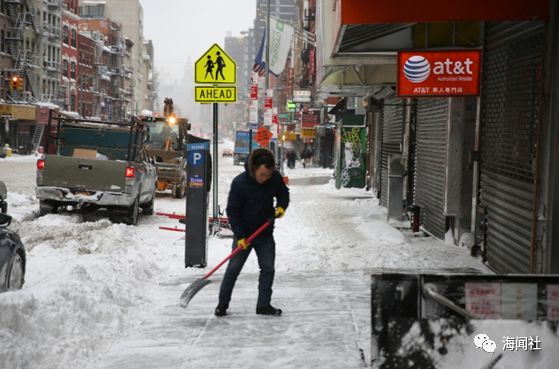 纽约一名华裔业主正清扫自家门前的积雪。