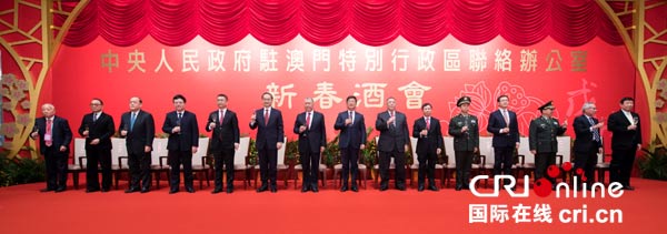 国际在线报道(记者刘丽斌):中央人民政府驻澳门特别行政区联络办公室2月8日下午在澳门旅游塔举行2018年新春酒会,中联办主任郑晓松和澳门特区行政长官崔世安分别致辞,向澳门同胞致以新春的祝福。全国政协副主席何厚铧、外交部驻澳门特派员公署特派员叶大波、驻澳部队司令员廖政荣少将、政委周吴刚少将、澳门立法会主席贺一诚以及澳门社会各界人士1460人出席了酒会。