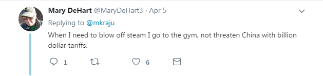 对此,网友玛丽(Mary Dehart)讽刺地说:我想发泄的时候会去健身馆,而不是威胁要对1000亿美元的中国产品征税。