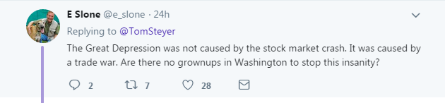 网友斯隆(E Slone)则表示,美国曾经的大萧条不是由股市崩盘引起的,而是由贸易战引起的。他反问:“难道华盛顿就没有一个成年人可以阻止这个疯子吗?”