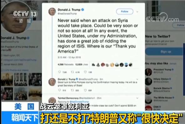 美国东部时间12日一大早,特朗普就又发“推特”说,“对叙利亚的军事打击可能很快,也可能不那么快”;他可“从来没说过什么时候打叙利亚”。