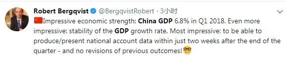 瑞典经济学家罗伯特•博格奎斯特在推特上(Robert Bergqvist)点赞“中国速度”:“2018年中国一季度GDP增速为6.8%,这十分令人吃惊,更吃惊的是中国经济增长的稳定性,最最吃惊的是在没有参考以往数据的前提下,中国在两周内就能统计出第一季度的全国经济数据。”