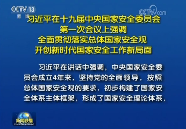 央视网消息(新闻联播):中共中央总书记、国家主席、中央军委主席、中央国家安全委员会主席习近平4月17日下午主持召开十九届中央国家安全委员会第一次会议并发表重要讲话。习近平强调,要加强党对国家安全工作的集中统一领导,正确把握当前国家安全形势,全面贯彻落实总体国家安全观,努力开创新时代国家安全工作新局面,为实现“两个一百年”奋斗目标、实现中华民族伟大复兴的中国梦提供牢靠安全保障。