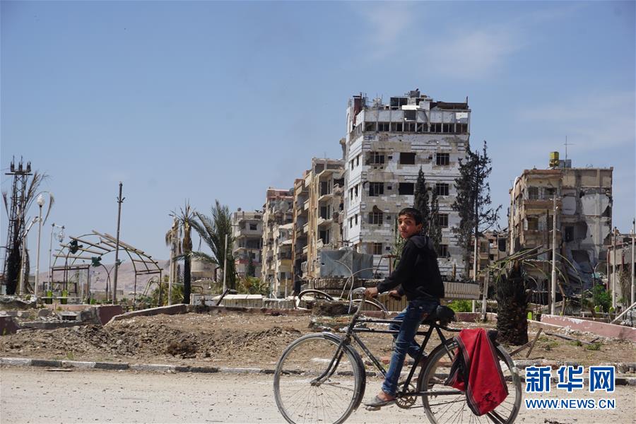 4月16日,在叙利亚大马士革东郊杜马镇,一名儿童骑车经过杜马镇中心广场。