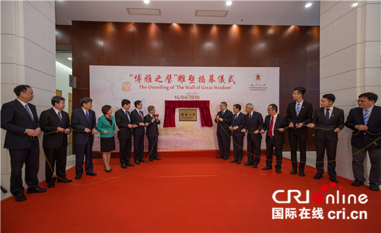 由国家教育部向澳门大学赠送的“博雅之璧”雕塑16日举行揭幕仪式,澳门特区行政长官崔世安、国家教育部部长陈宝生、澳门中联办副主任孙达、澳门社会文化司司长谭俊荣等出席揭幕仪式