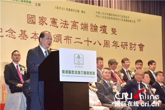 国际在线报道(中国国际广播电台驻香港记者 年永刚):21日,香港特别行政区举行国家宪法高端论坛暨纪念《基本法》颁布28周年研讨会。来自中央政府及香港特区政府的官员、法律专家、经济专家、青年代表等共千余人出席论坛,共同研讨、推介、认识国家宪法与“一国两制”的紧密关系。