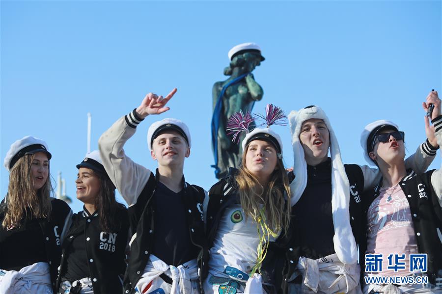 4月30日,在芬兰首都赫尔辛基市中心,一群学生为阿曼达雕像戴上学生帽后尽情欢唱。每年的4月30日是赫尔辛基的大学生戴帽节。这一天,学生们在吊车的帮助下为赫尔辛基市中心的少女阿曼达雕像戴上帽子,人们聚集在雕像周围尽情狂欢。新华社记者 李骥志 摄