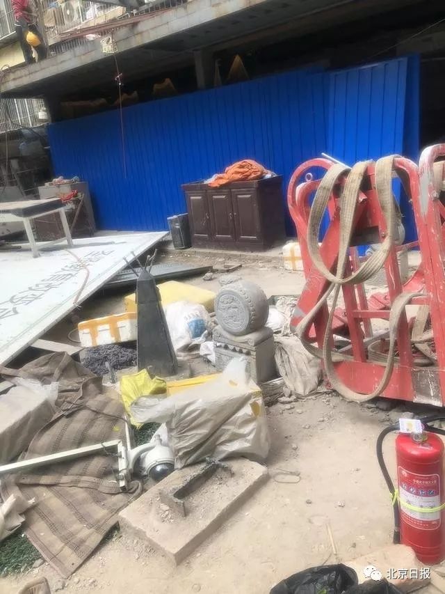 楼外地面上散乱堆放着各种拆下的杂物,包括摄像头、门墩等。
