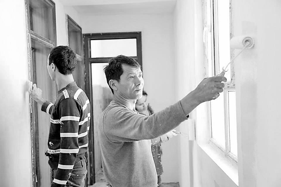 4月19日,忙力克 · 托合提如则(右)在工地上粉刷房屋。