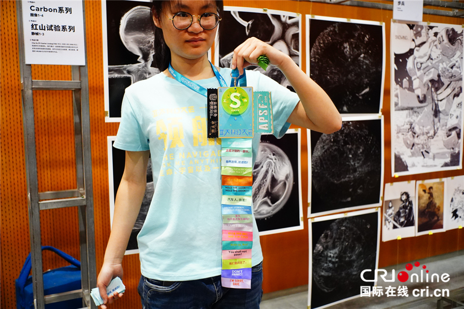 亚太科幻大会科幻画廊 志愿者向记者展示科幻大会各处搜集的丝带赠品