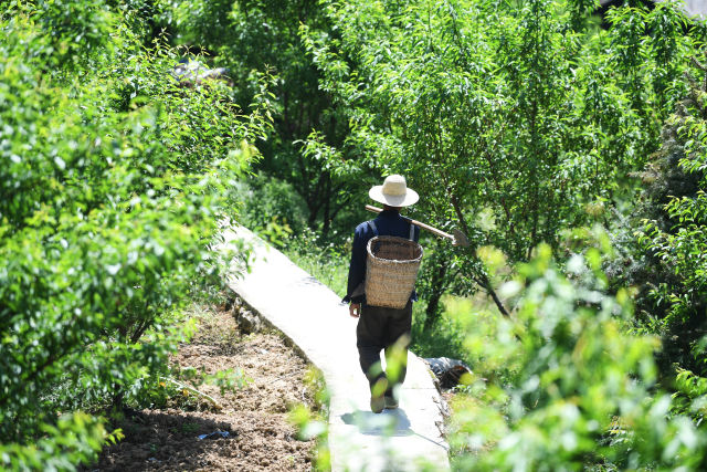 4月17日,王恩海前往李子树林劳作。新华社记者王全超摄