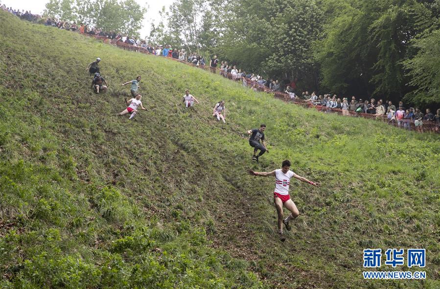 5月28日,选手在“滚奶酪”比赛中。