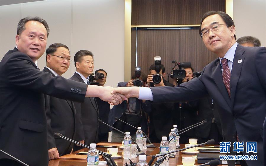 6月1日,在板门店韩方一侧的“和平之家”,韩国统一部长官赵明均(右)与朝鲜祖国和平统一委员会委员长李善权握手。韩国和朝鲜6月1日在板门店韩方一侧的“和平之家”举行高级别会谈,就履行《板门店宣言》的具体方案和后续措施达成一致。 新华社发