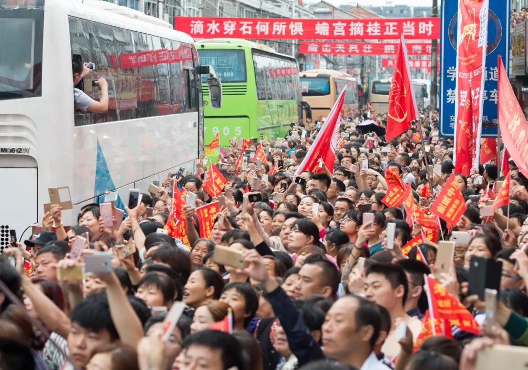 ▲2017年6月5日,在六安市毛坦厂中学外,考生家长和当地居民为考生送行。(新华社记者 郭晨 摄)