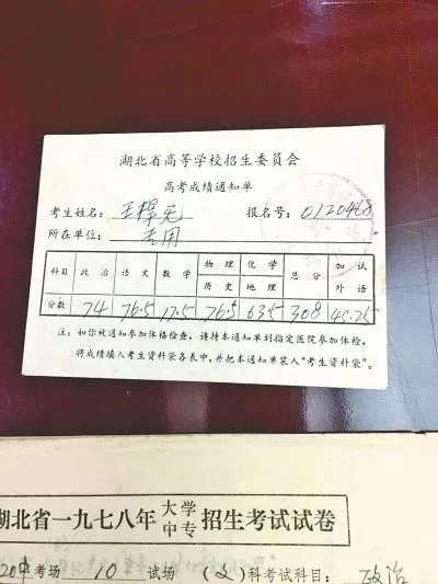 在武汉市档案馆有一份1978年的高考全套试卷,捐赠人是王汗吾(曾用名王捍无),那年他语文76.5、数学考了17.5分、政治74,以308的总分,45.25的英语加分上了大学。