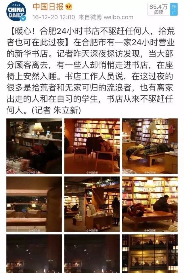 安徽合肥有一家24小时营业的新华书店。深夜,当大部分顾客离去,有一些人却悄悄走进书店,在座椅上安然入睡。书店工作人员说,在这过夜的很多是拾荒者和无家可归的流浪者,也有离家出走的人和在自习的学生,书店从来不驱赶任何人。
