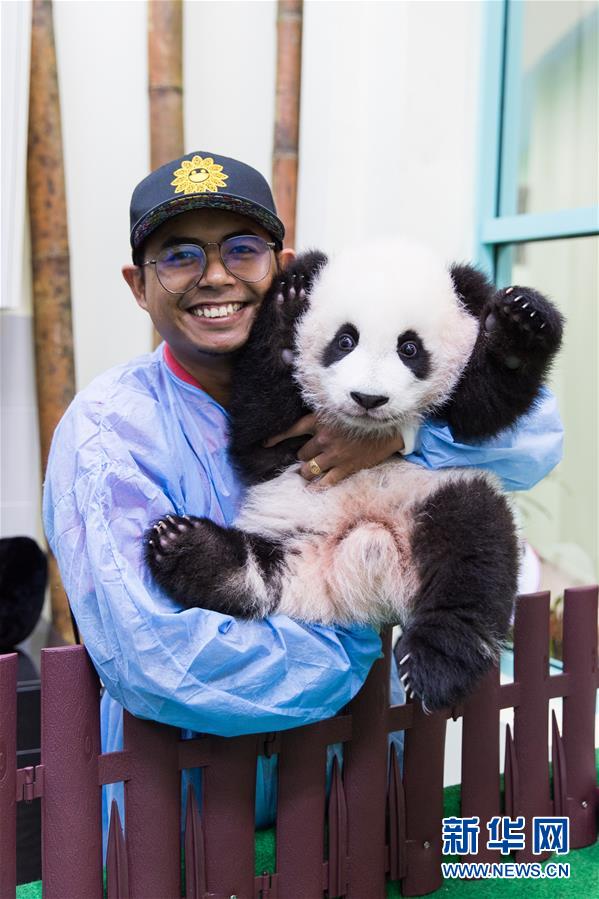 6月7日,在马来西亚吉隆坡附近的马来西亚国家动物园,阿克迈勒与大熊猫宝宝合影。