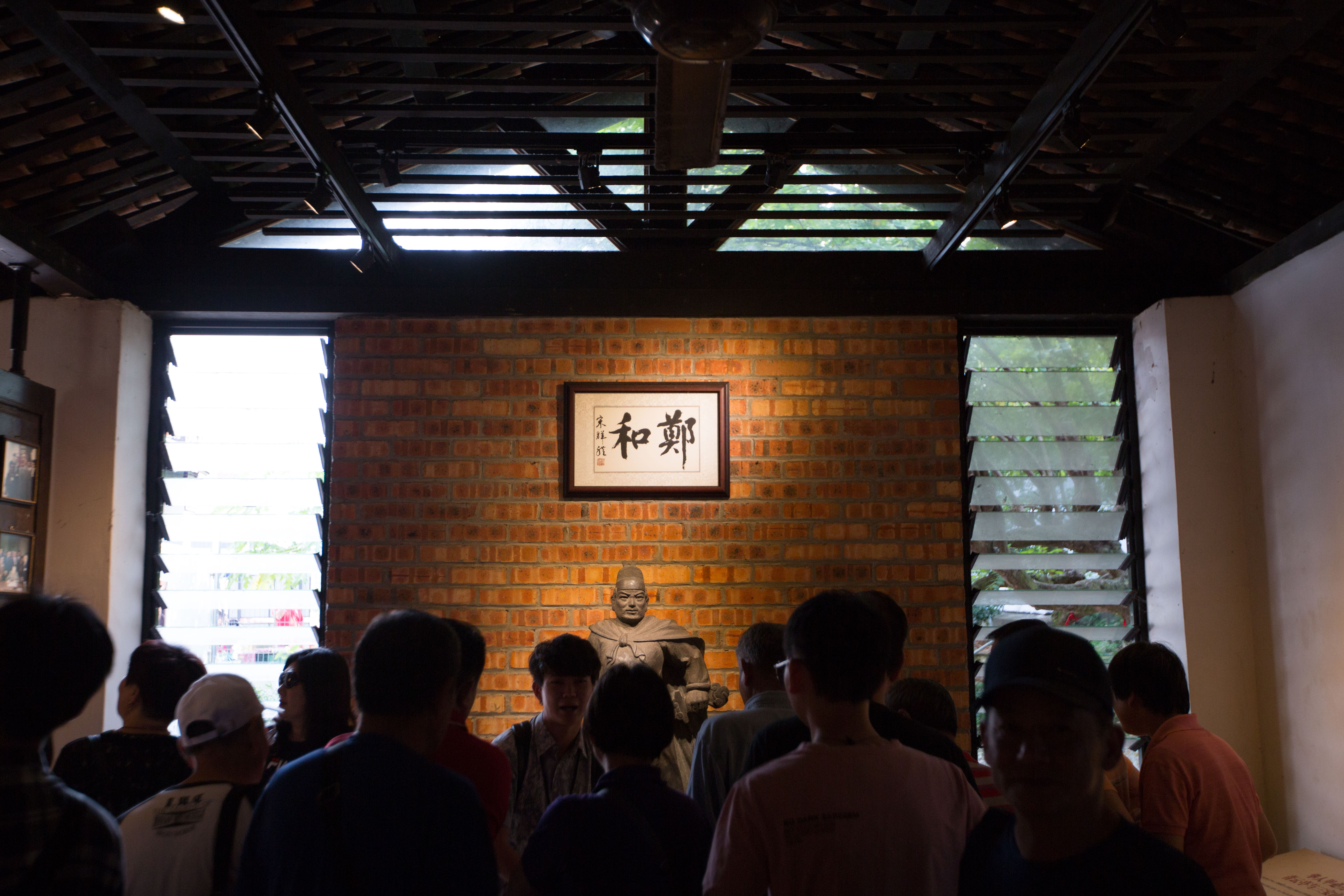 ↑6月9日,在马来西亚马六甲,游客在宝山亭内参观郑和雕像。新华社记者朱炜摄