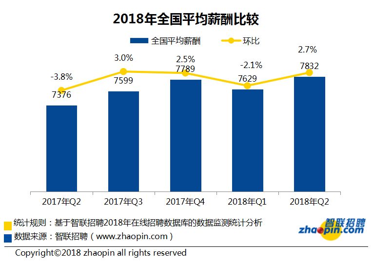 全国37个主要城市的平均招聘薪酬为7832元,环比上升2.7%;