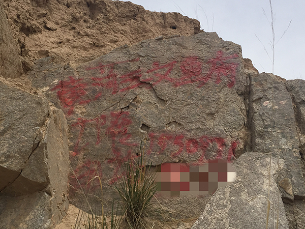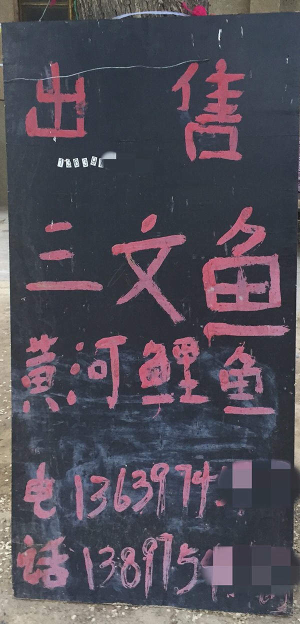 逐渐靠近龙羊峡镇的路边不再有广告牌,但在路旁的岩壁上,有很多用彩色油漆喷涂的歪歪扭扭的字体,上面打着简单的广告。比如,某某农庄“黄河三文鱼”,“黄河野生鱼、三文、鲤鱼”再加上一个电话号码,这种简单的广告随处可见。