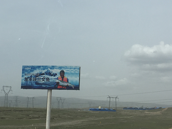 从西宁市出发,沿京藏高速公路向西倒一级公路行驶,翻过日月山后再向左边道路拐弯时,在一旁的空地上立着一块广告牌。广告牌上写着“来自雪域高原龙羊峡三文鱼”几个大字,一位衣着橙色救生衣的中年男子双手抱着一条长度超过人肩宽的鱼。这块广告牌也为去龙羊峡的人指明了方向。