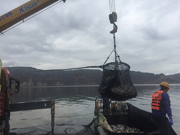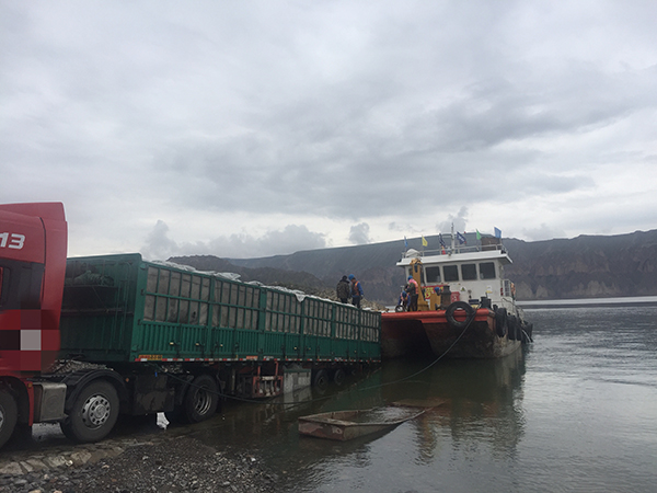 澎湃新闻6月初在龙羊峡水库的码头看到,一边,四五个民泽公司的工人正把饲料一袋袋地从一辆红色陕西重汽卡车上卸至运输船上;另一边,一辆经改装的红色东风吊车正用抓手将运鱼船上的虹鳟鱼抓进吊车上盛有冰的黄色箱子内,抓手边抓边称重。据正在作业的民泽工人介绍,估计当天有5000多条鱼分六七次运到岸边,并送往位于共和县的加工厂进行加工。平均每条鱼重4.5千克,5000多条相当于重22吨。