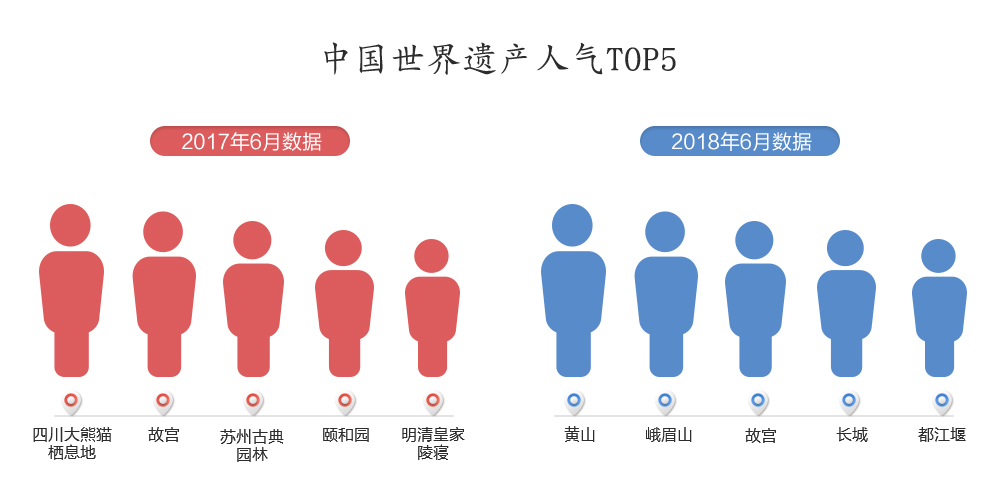 2017年6月,我国首个“文化和自然遗产日”之际,国内某旅游网结合平台数据发布《中国世界遗产人气榜》:四川大熊猫栖息地、故宫、苏州古典园林、颐和园、明清皇家陵寝成为人气最高的中国世界遗产景区前5名。