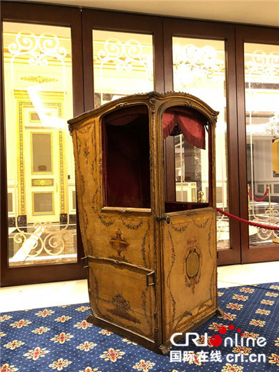 展品为法国路易十六时期制作的造型时尚、设计精美的轿车椅。
