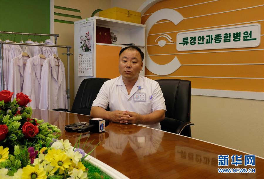 7月23日,在朝鲜平壤,柳京眼科综合医院白内障科科长崔均真接受记者采访。柳京牙科医院和柳京眼科综合医院,是两座近年新落成的现代化专科医院,以舒适的环境和先进的设施和技术,为众多朝鲜民众提供现代化医疗服务。近日,记者走进了这两家同处一个院落中的专科医院。新华社记者 程大雨 摄