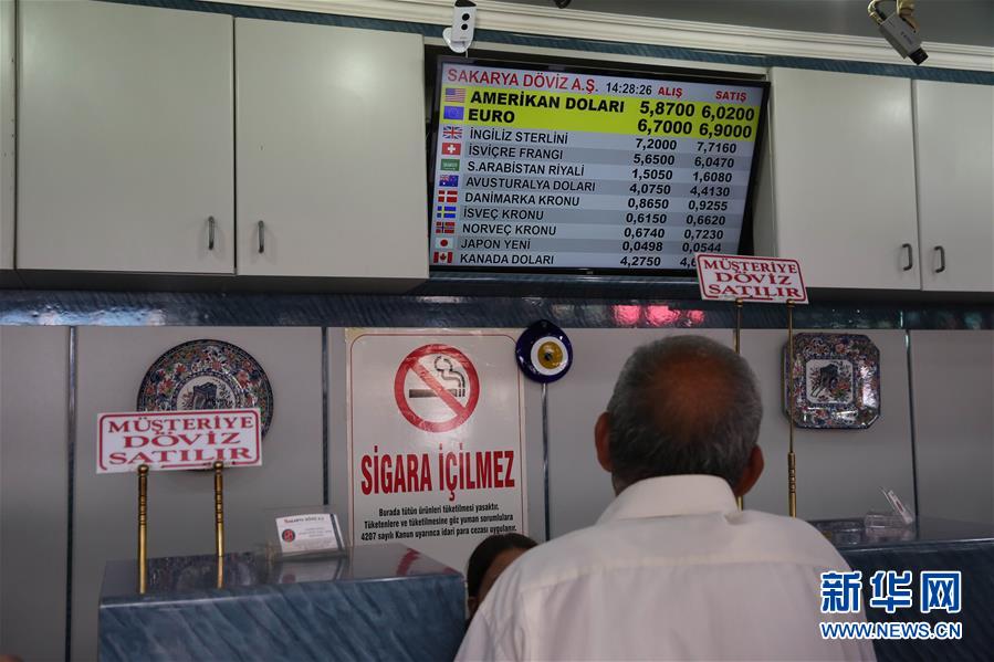 8月10日,在土耳其安卡拉,一名男子看着显示汇率的屏幕。