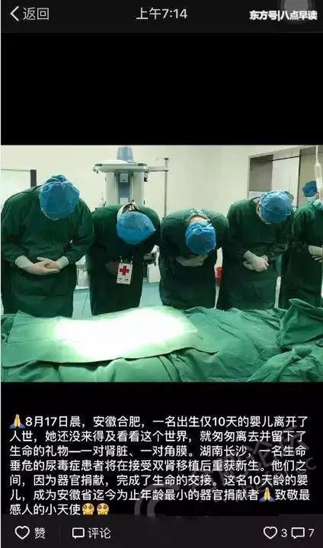 安徽合肥,一名出生仅10天的婴儿离开了人世。她还没来得及看看这个世界,就匆匆离去并留下了生命的礼物——一对肾脏、一对角膜。
