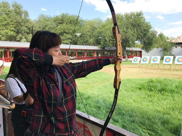 游人在锡伯古城体验射箭 新华网 周欣摄