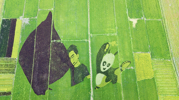 在察布查尔县纳达齐牛录乡,有一片总占地面积600多亩的稻田画,游人们站在27米的观光塔上,可以清晰地看到“战狼2”“功夫熊猫”“米老鼠唐老鸭”等彩稻组成的图案。这个名叫“绿梦飞扬”的稻田画基地始建于2015年,水稻品种均引自沈阳市沈北新区彩色水稻系列。