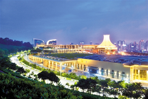 会展豪生酒店与会展大厦如绿叶衬托着朱槿花厅。本报记者潘浩 摄