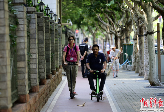 8月31日,上海浦东碧云国际社区,布鲁和伊拉里亚夫妇骑着电动滑板车准备接孩子放学。据介绍,这个社区外籍人士家庭占90%左右。