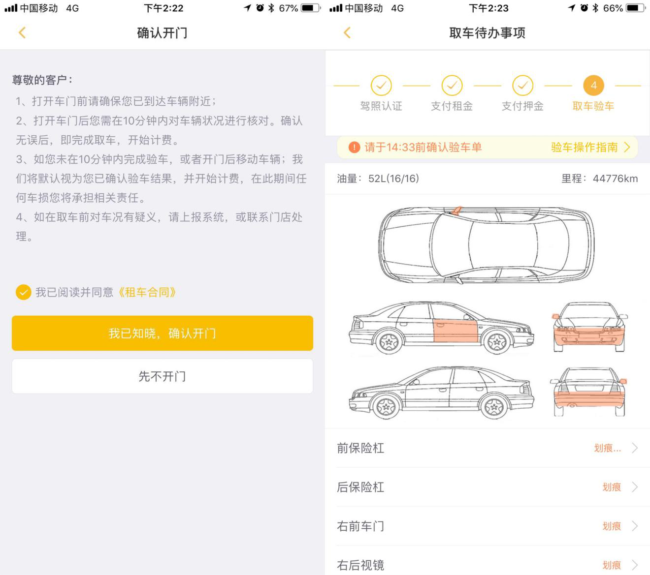 在神州租车APP上进行驾照认证、租金和押金的支付后,就进入了取车验车的环节。
