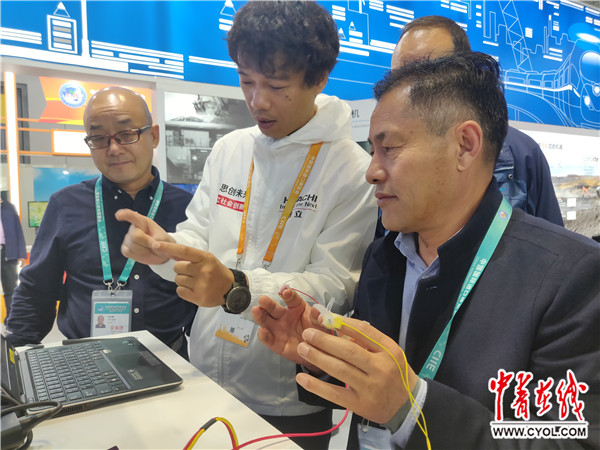 11月9日,几位市民在体验和参观日立公司展出的磁感应手指活动检测仪UB2。