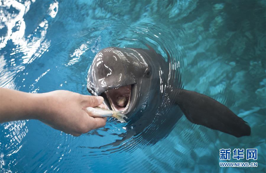 11月10日,中科院水生所武汉白鱀豚馆饲养员给长江江豚喂食。 新华社记者肖艺九摄